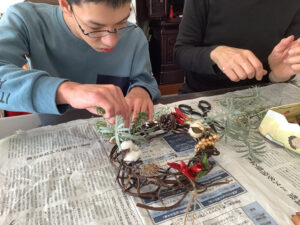 平面に埋め込んだカバサでは、右手をカバサの上に置き、左手近くにウインドチャイムを設置しました。カバサと共に、左手に設置したツリーチャイムも手を揺らして鳴らしていました。やりながら活動を思い出したように笑顔が出てきました。ツリーチャイムも大きな手の動きだけでなく小刻みに手を揺らすように鳴らしたり、肘を当てて鳴らしたりしていつもより鳴らし方のバリエーションが多かったように感じました。
