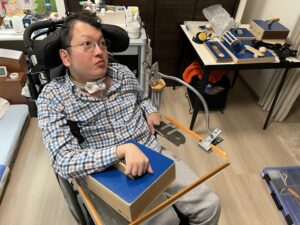 ・スイッチ操作:iPadの操作をスライドスイッチで行いました。奥山支援員の11月の音楽情報を手まえに引く動きでスライドを進めました。振動スピーカーを使用しました。先ほどと同じようにウインドチャイムを設置しました。この時も画面に深く食い入るように見続けていて、関心の高さがわかりました。