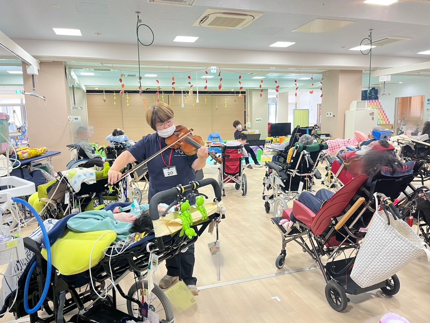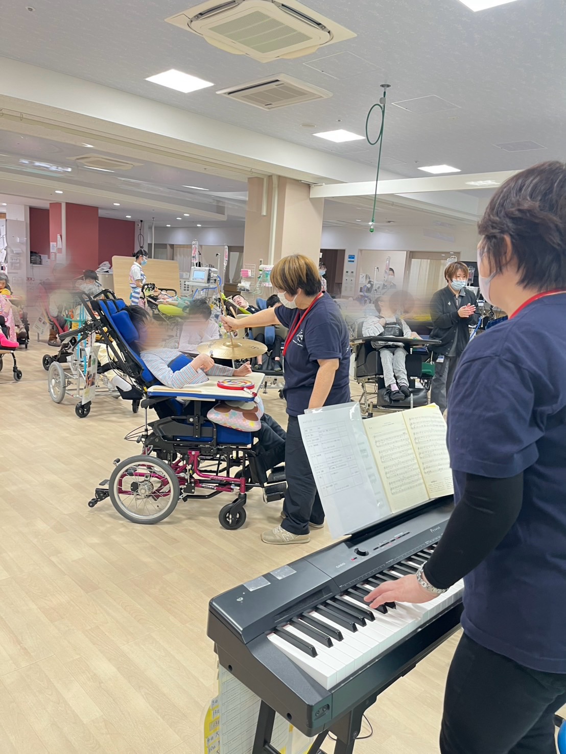 再開は、姫路にあるマリア病院ルルド館からのスタートです。久しぶりに会う入所している子供達や大人の方々、みなさん変わりなく元気に過ごさせていて、とても嬉しく思いました。懐かしいスタッフさん、入所者さんに歓迎され、大盛り上がりでセッションを終えました。内容は、ピアノに合わせてストレッチしたり、『みかんの花咲く丘』や『茶つみ』の曲を手拍子や手遊びをしながら、さとがボサノバ風などにアレンジして楽しみました。続けてゆかのバイオリンとさとのピアノで情熱大陸!会場(フロア)は大盛り上がり!最後は、バイオリンの演奏を聞いていただいてクールダウンして終わりました♪次の活動がすでに楽しみです!