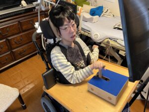 ・視線入力:モニターをセッティングして待っていてくれました。ご家族に設定いただいたポジションで調整なしですぐにスタートできました。いつものように風船割りからはじめ、車、玉、花火、塗り絵、金魚、塗り絵、対戦塗り絵の順に取り組みました。風船割りでは、風船をすぐに注視するのでなく、動く風船に誘導されて視線が一緒に動いてゆく様子が何回かありました。これは初めての動きでした。右側に視線がたまることが多かったのですが、左側は難しいよねと伝えると、左の方へ視線がゆくように調整する様子が見られました。金魚も対戦塗り絵も根気よく取り組んでいました。