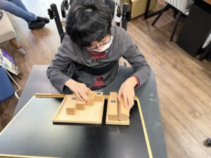 さらに、5を基準とした10までの合成・分解にも取り組みました。試行錯誤しながら棒をはめる場面と、最初から正しい棒を選べる場面の両方があり、ぴったりはまった瞬間には笑顔でハイタッチして喜び合いました。