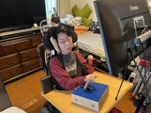 本日もモニターをセッティングして待っていてくれました。ご家族に設定していただいたポジションで、調整なしですぐにスタートできました。いつものように風船割りから始め、車、玉、花火、対戦塗り絵の順に取り組みました。今日は上の方に視線が寄りがちでしたが、意識して他の方向にも動かす場面が見られました。