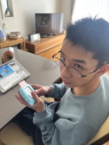 次に小さなクレーンゲームをやりました。スイッチ部分が小さめでした。コインを入れるのは、小さくて難しいようなので、こちらでやりました。レバーを左右に操作した後に、上下ボタンを押す2段階の操作が必要になります。クレーンゲームは、小学部の時から大好きでしたので意欲がありました。スイッチ操作もすぐに覚えました。身を乗り出してゲームをしていました。目と指を協応させていました。やはり、興味ある教材だと意欲と上達が早いことがわかります。